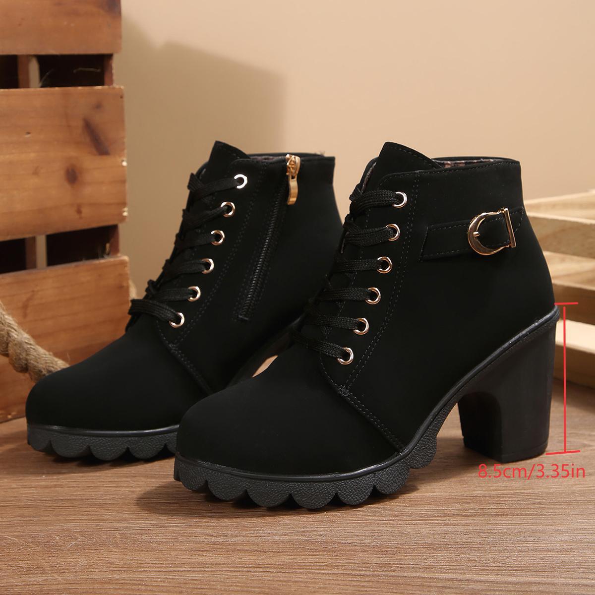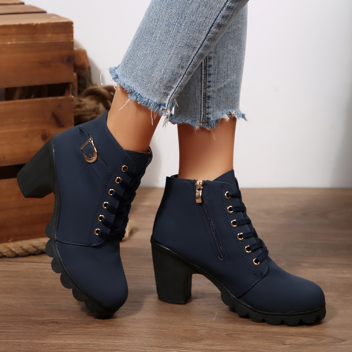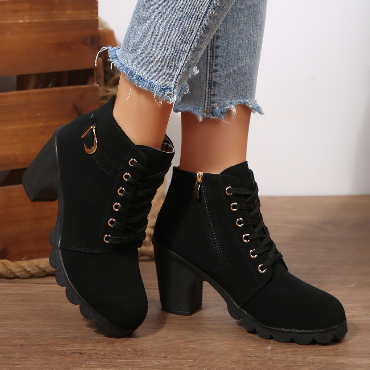 Chunky Heel Women's Leather Boots Low Cuff Round Toe High Heel Lace-Up Style with Heightening and Slimming Effect