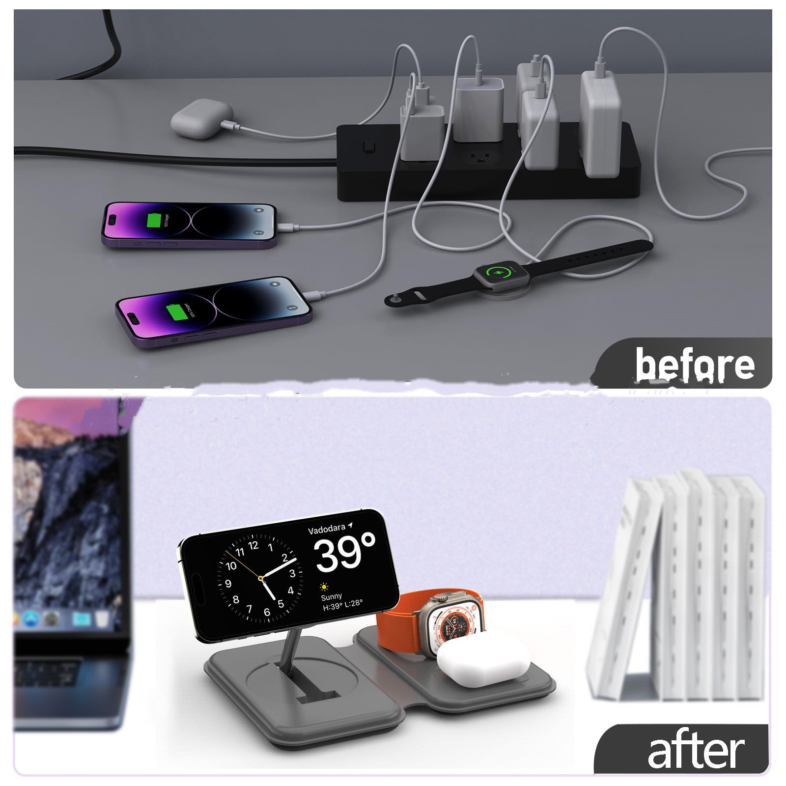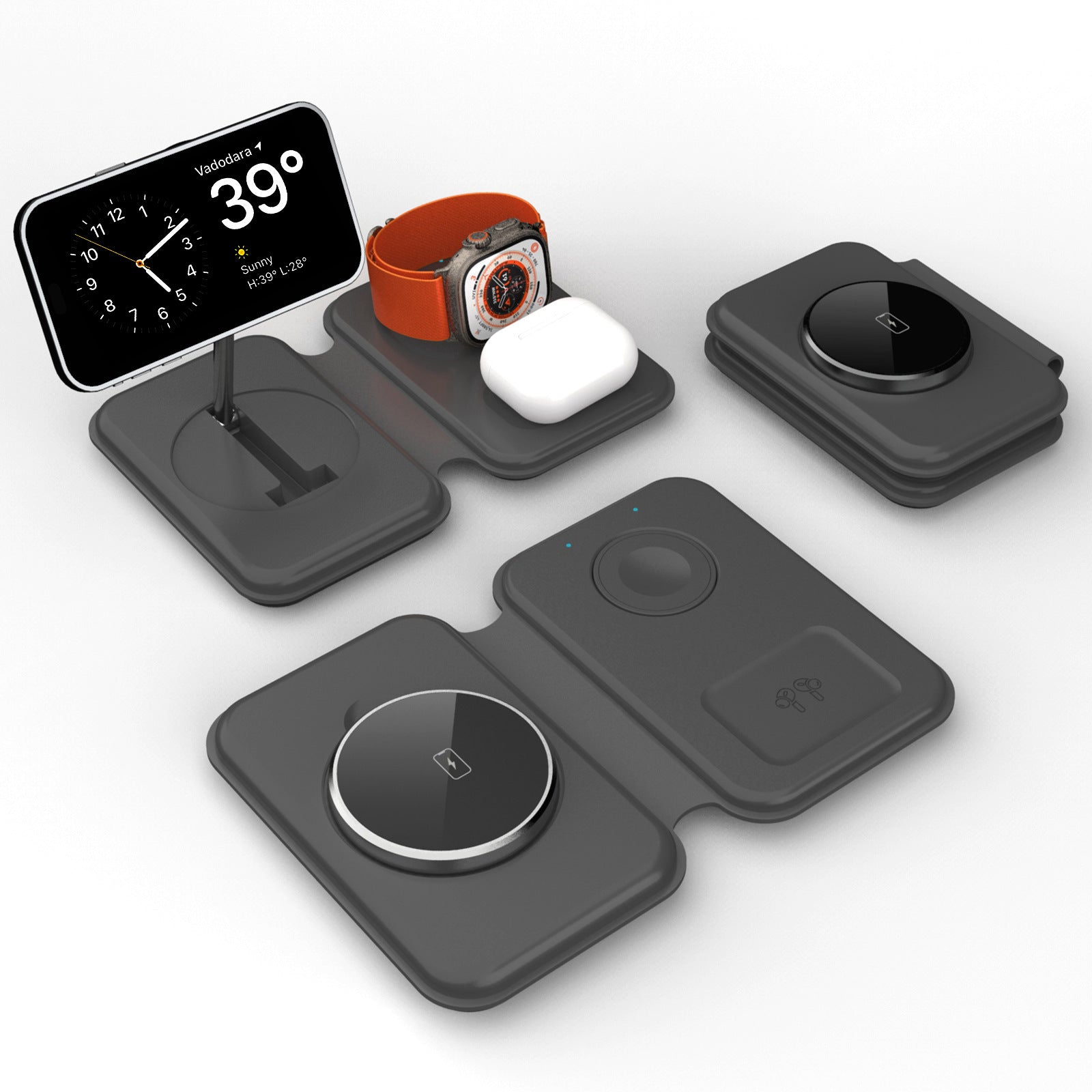 Cross-border New Folding Magnetic Three-in-one Wireless Charger Electrical Zinc Alloy Desktop Phone Holder Watch Wireless Charger