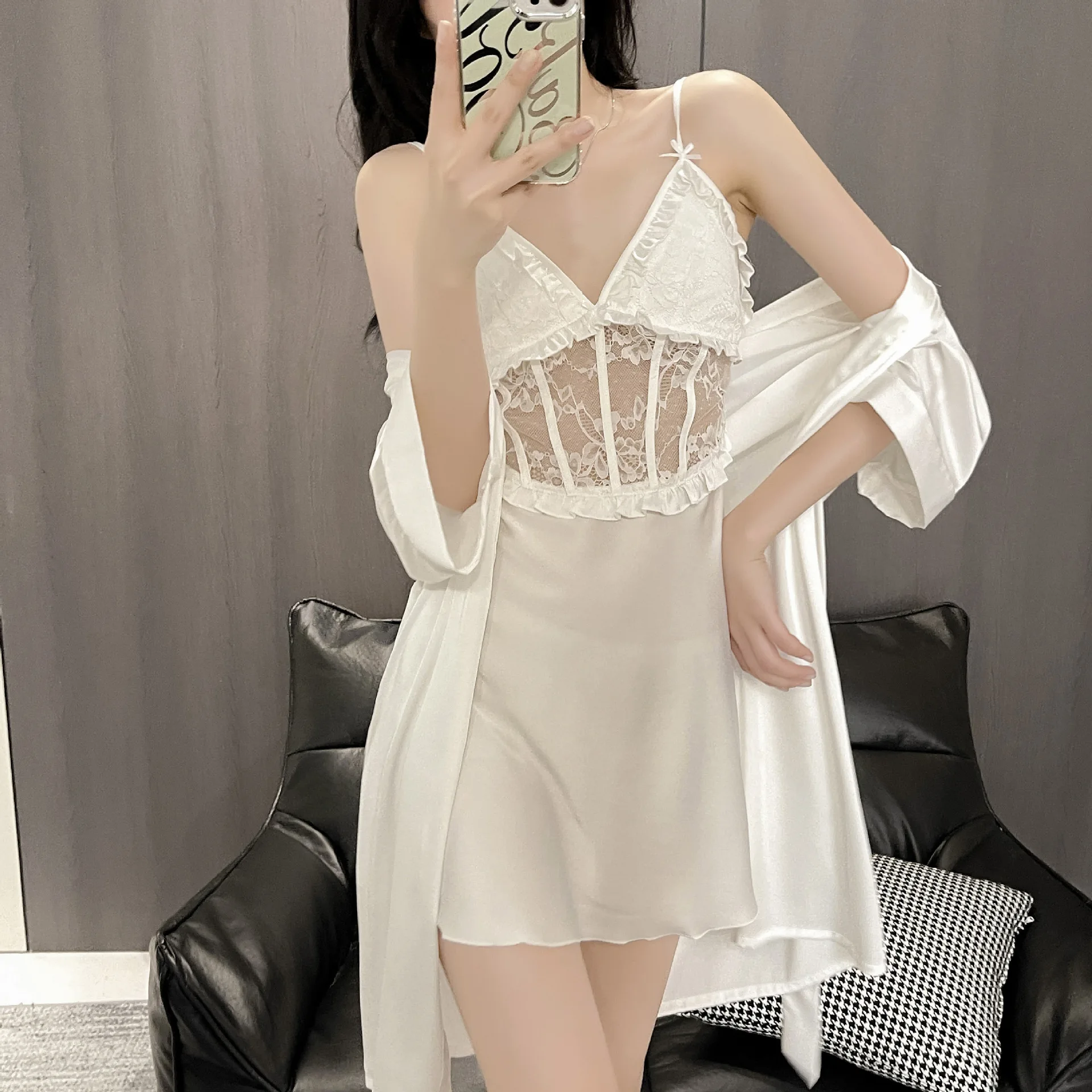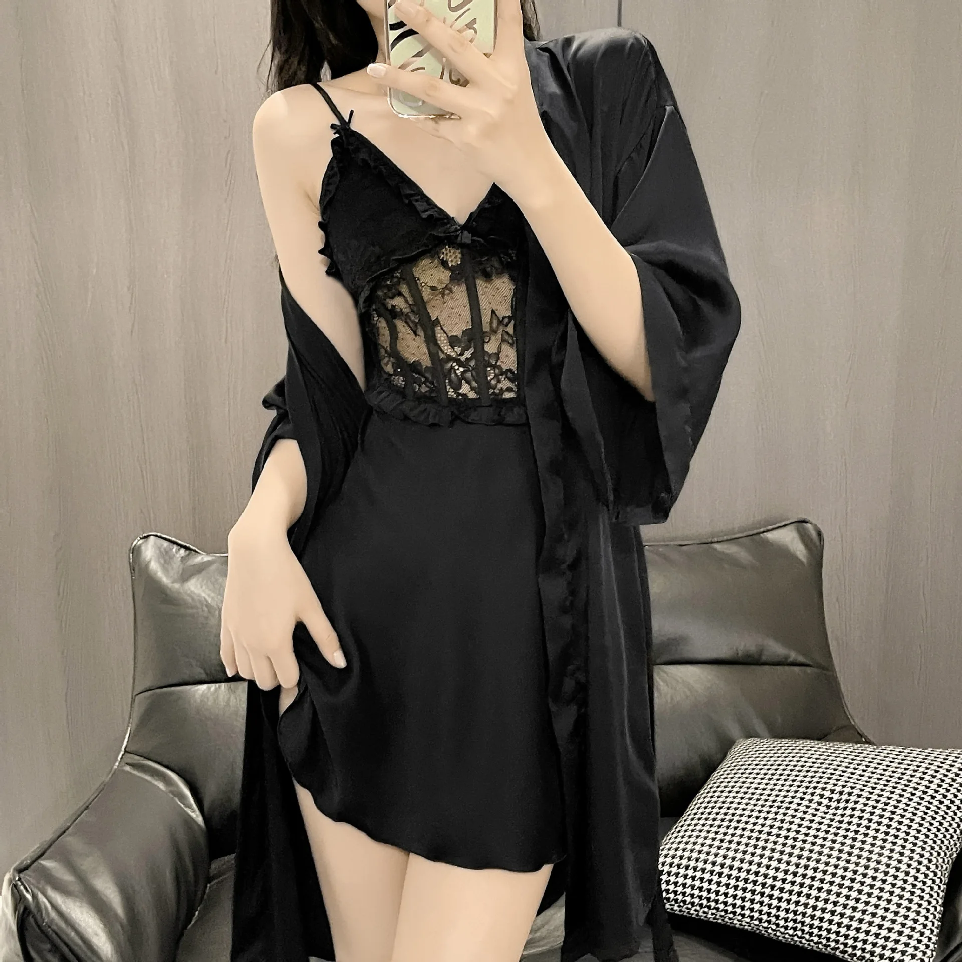 Sexy Sleepwear Women Night Dress Robe Sets Summer Deep V Satin with Chest Pads Lace Dress Home Wear Suits