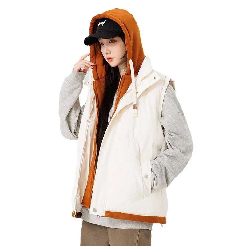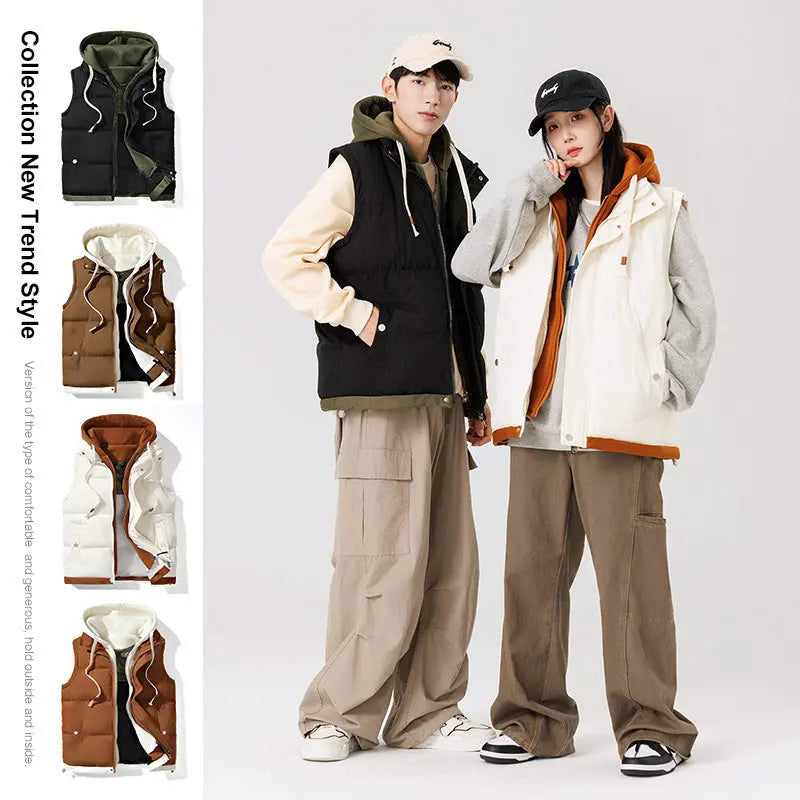 Teenage Graphene Down Cotton Vest for Men Autumn/Winter Mid-Student Faux Two-Piece Loose Couple Hooded Jacket