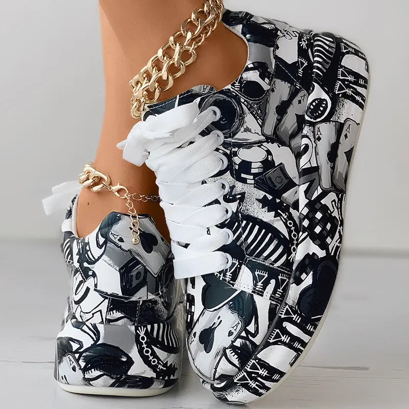 Women's Casual Round Toe Thick Sole Lace-Up Sneakers, Random Print Design, Comfortable Sporty Shoes For Daily Wear